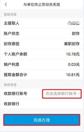 (3)选择或添加“收款银行账号”信息,核实信息无误后,点击“完成办理”。