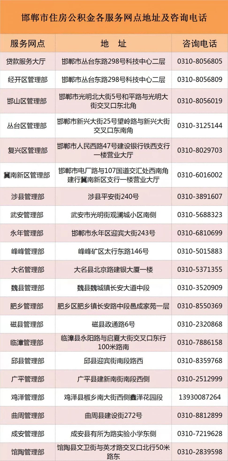 邯郸市住房公积金各服务网点地址及咨询电话一览