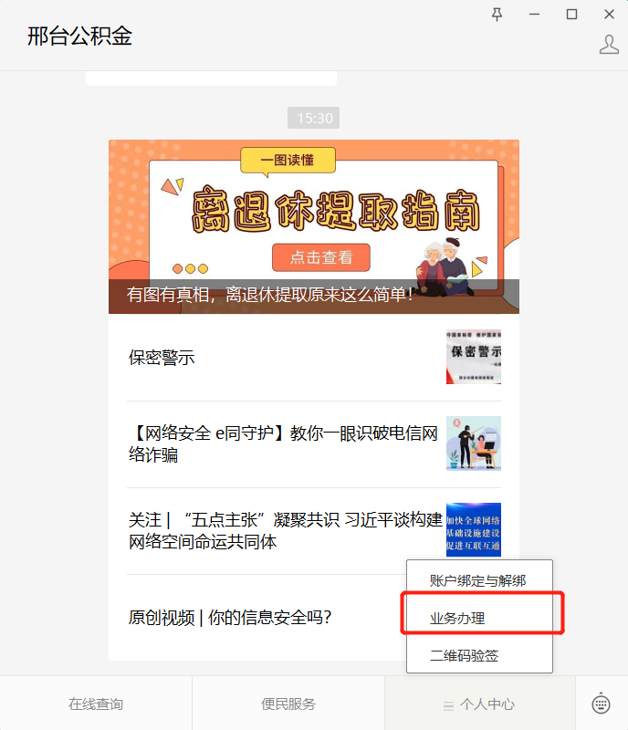 (3)进入“业务办理”,点击“离退休提取”,核对信息无误后,输入获取到的验证码点击提交即可办理。